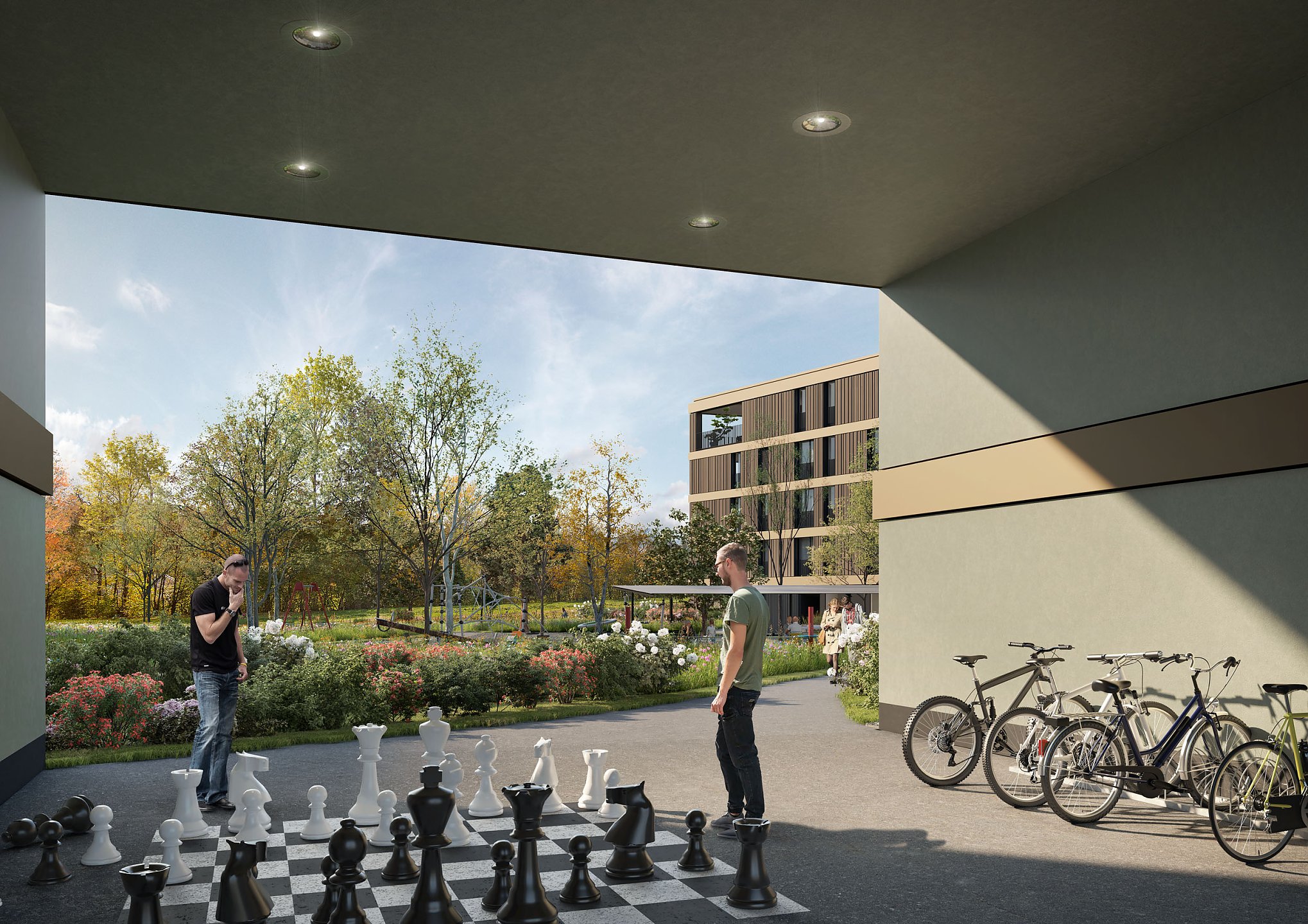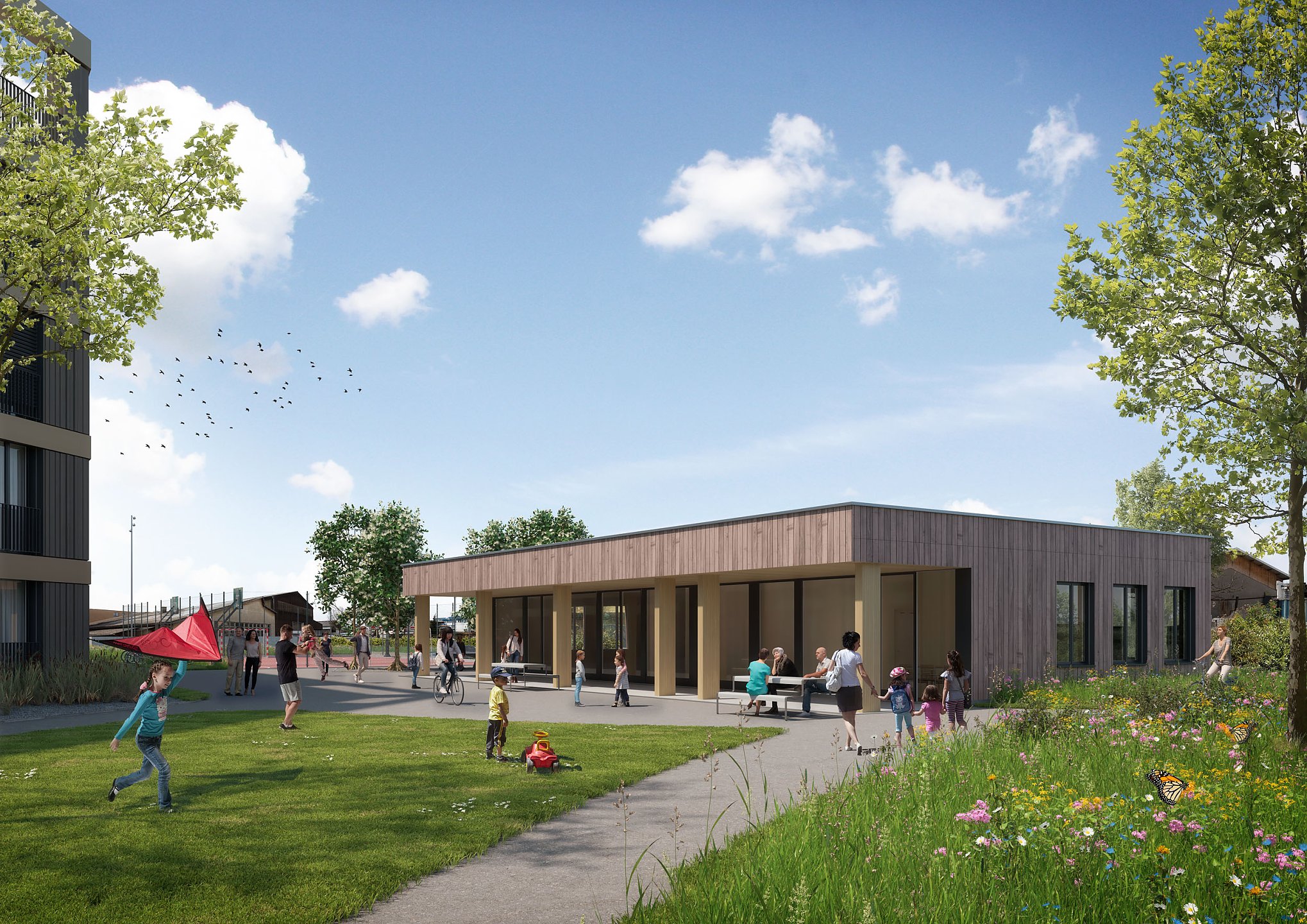 Für die Bewohnerschaft der Siedlung wird am Eingang des Quartiers ein grosszügiger Gemeinschaftspavillon erstellt. Dieser umfasst einen Saal für 50 Personen mit Küche, Garderobe, Toiletten und gedeckten Aussenbereich. Ergänzt wird das Raumangebot durch zwei individuell nutzbare Disporäume von rund 22 m² Grösse.