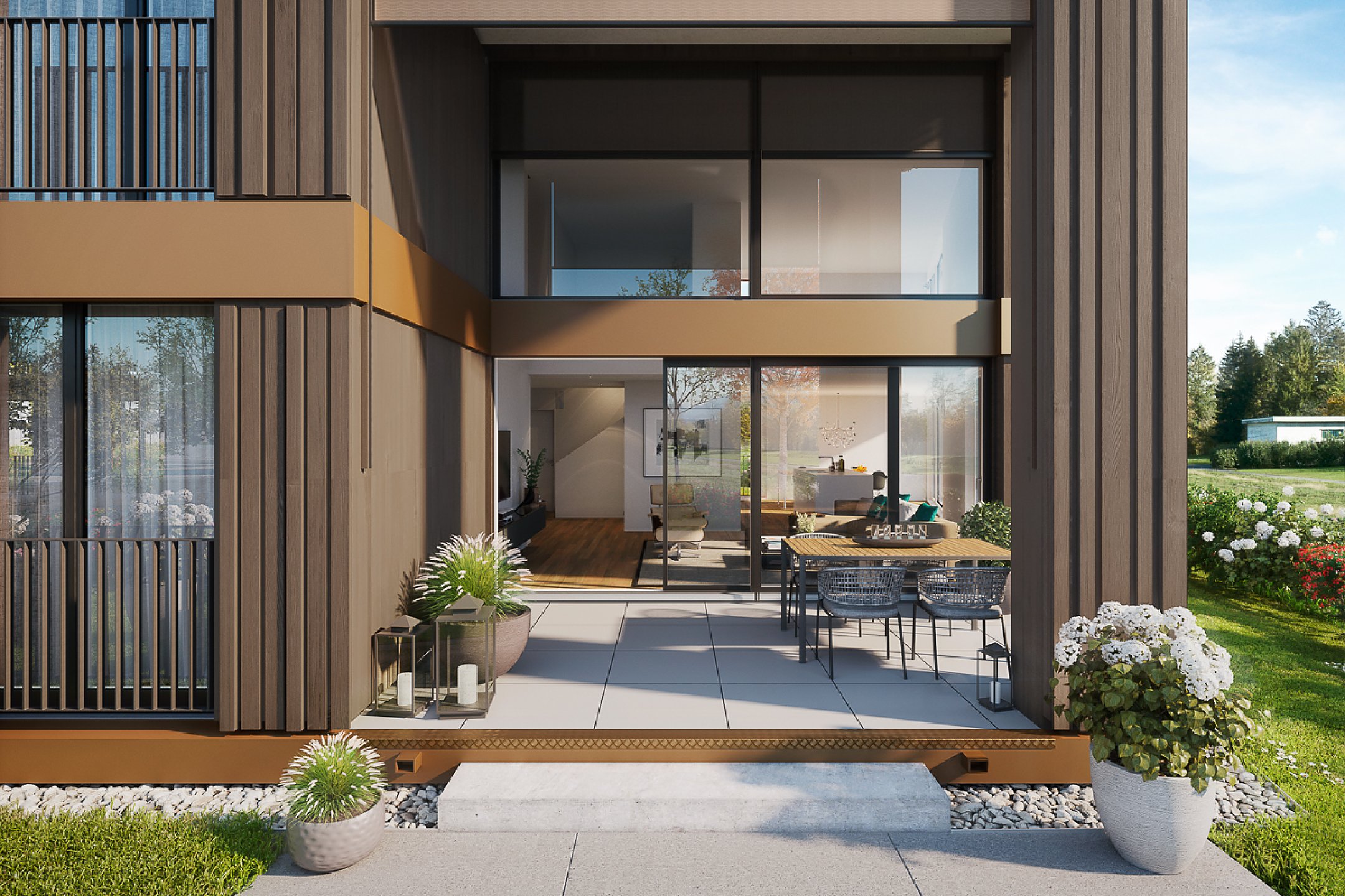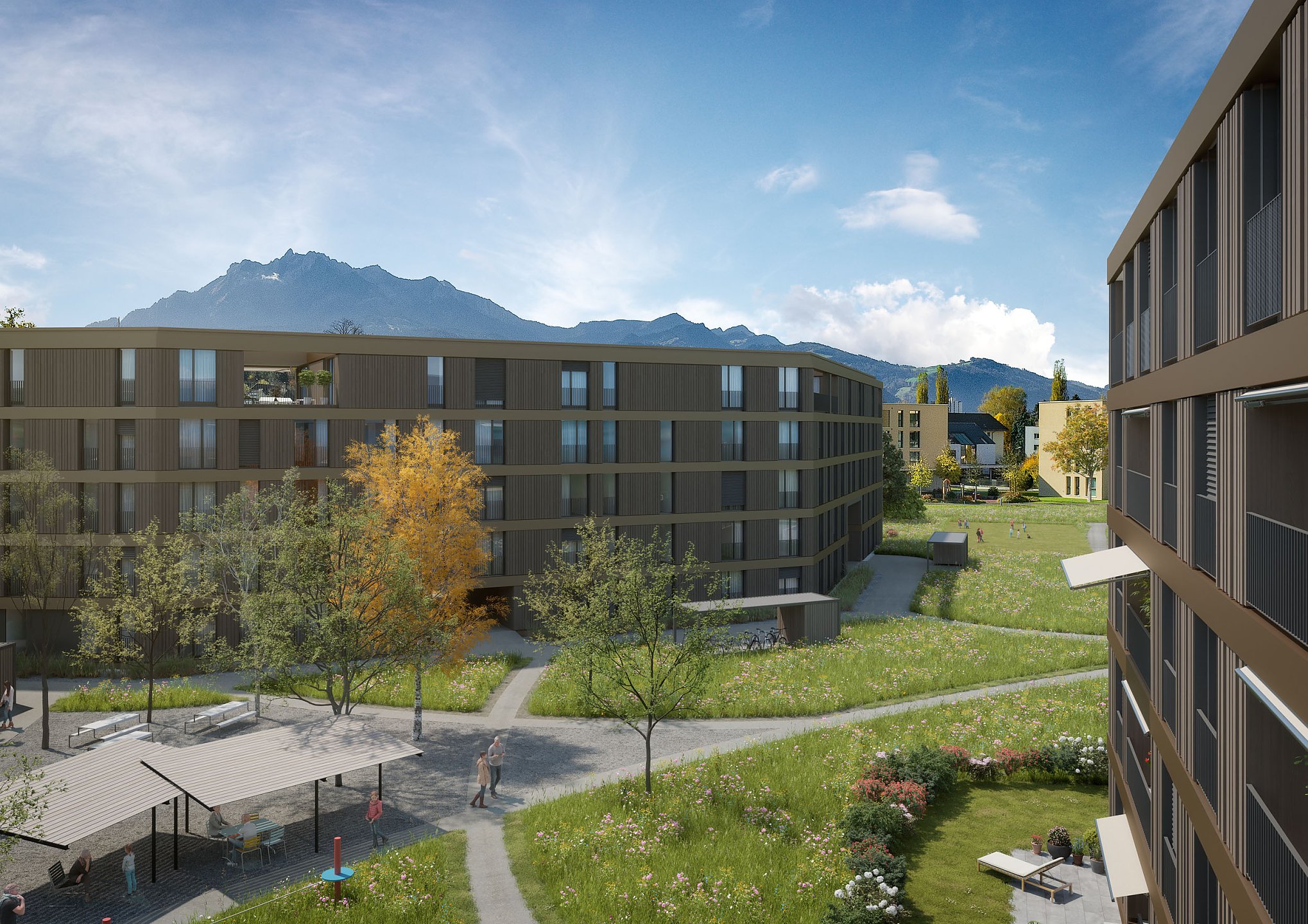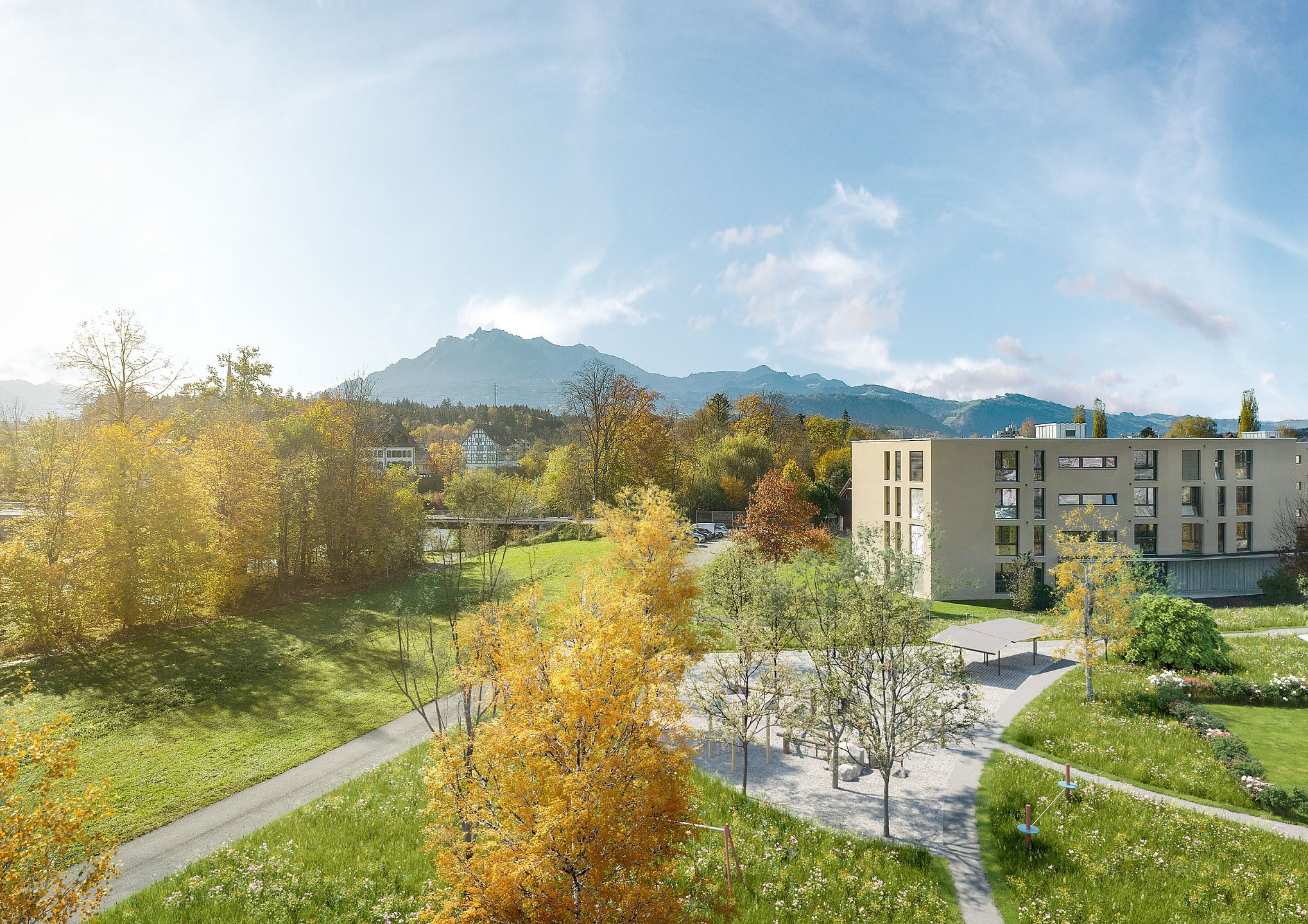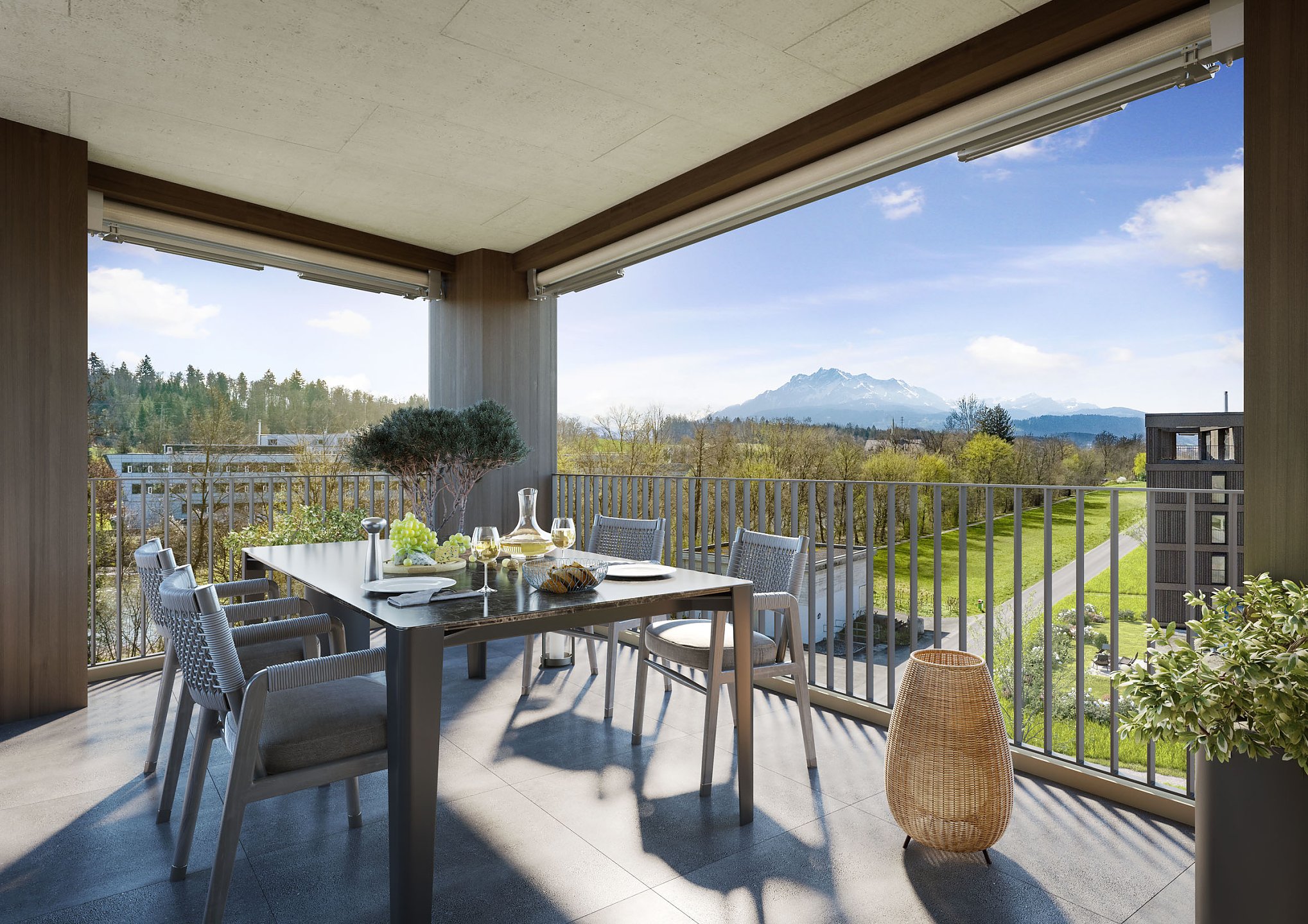 Die Erdgeschosswohnungen erhalten mit einer Staudenhecke Privatsphäre für die eigene Gartenfläche. Die Attika-Wohnungen orientieren sich mit gedeckten sowie offenen Terrassenbereichen stark nach Süden. Ein grossartiger Fernblick in die Naherholungsgebiete von Emmen mit Sedel/Rotsee bis hin zum Pilatus ist gewährleistet.