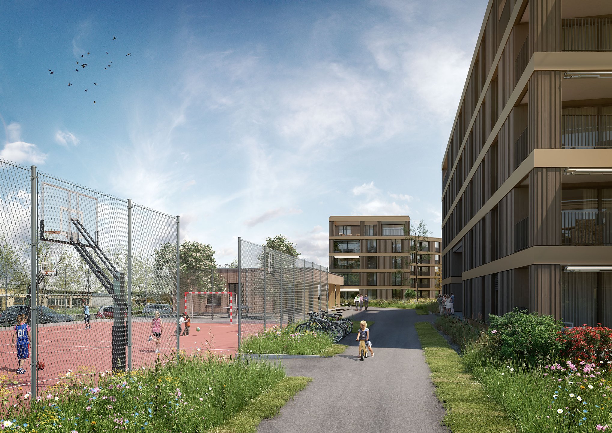 Dank einer unteridirschen Einstellhalle bleibt die Grünmatt oberirdisch grösstenteils autofrei. Ein feines Fusswegnetz durch die gesamte Siedlung verbindet die attraktiven Aussenräume und Begegnungszonen.
