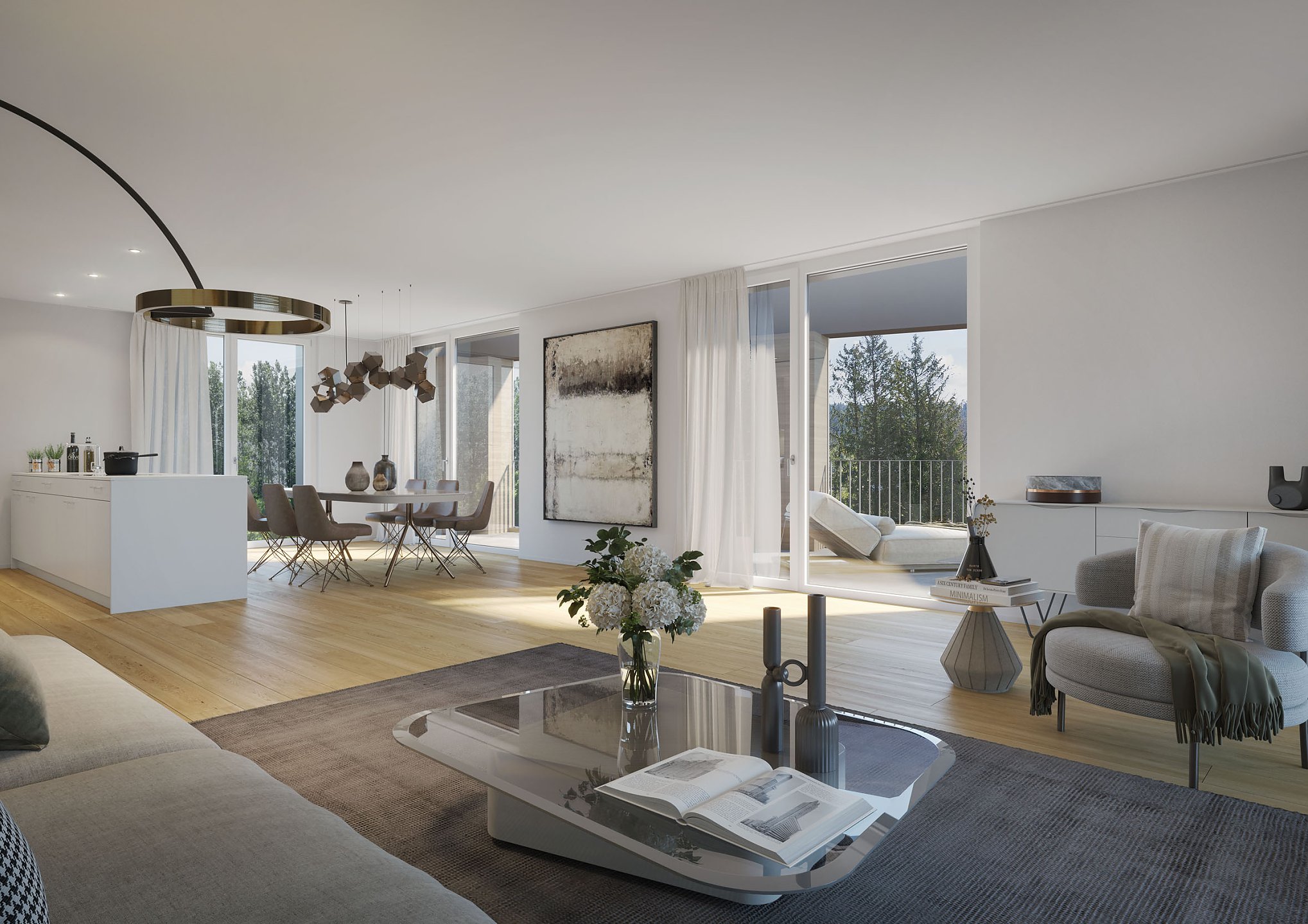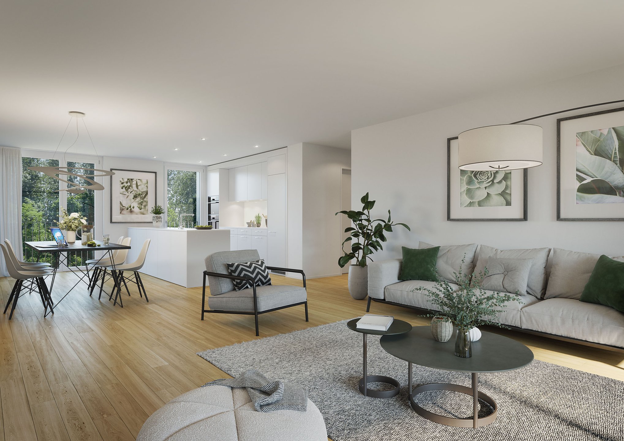 Jede Wohnung hat einen offenen Wohn-, Koch- und Essbereich. Die Grundrisse der grösseren Wohnungen sind als Durchwohnen gestaltet. Sie gehen quer durch die Gebäude, womit aus den Innenräumen über die raumhohen Fenster Sichtbezug in die Grünflächen und die Baumlandschaft entsteht.